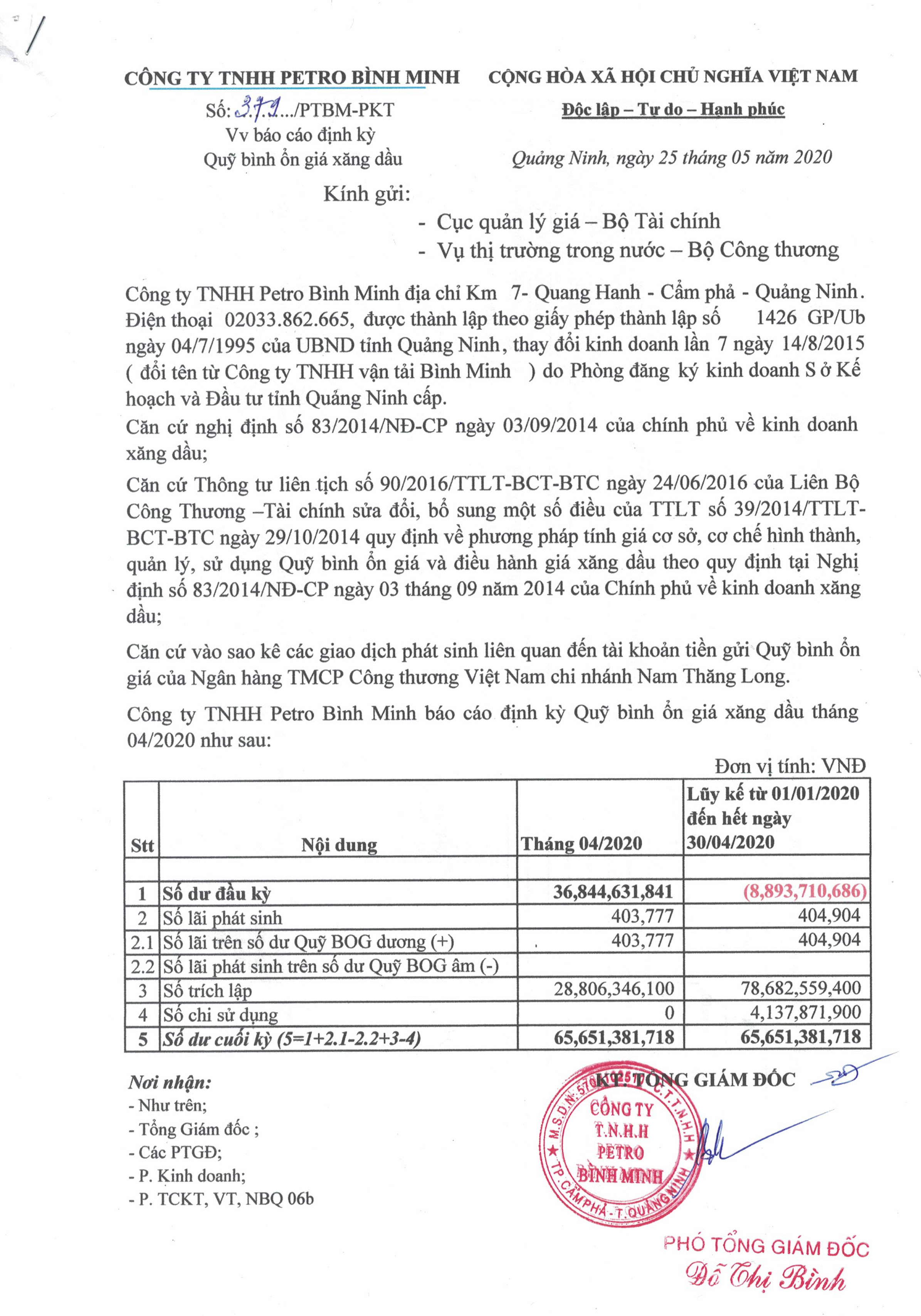Báo cáo định kỳ Quỹ bình ổn giá xăng dầu (BOG) - tháng 04/2020