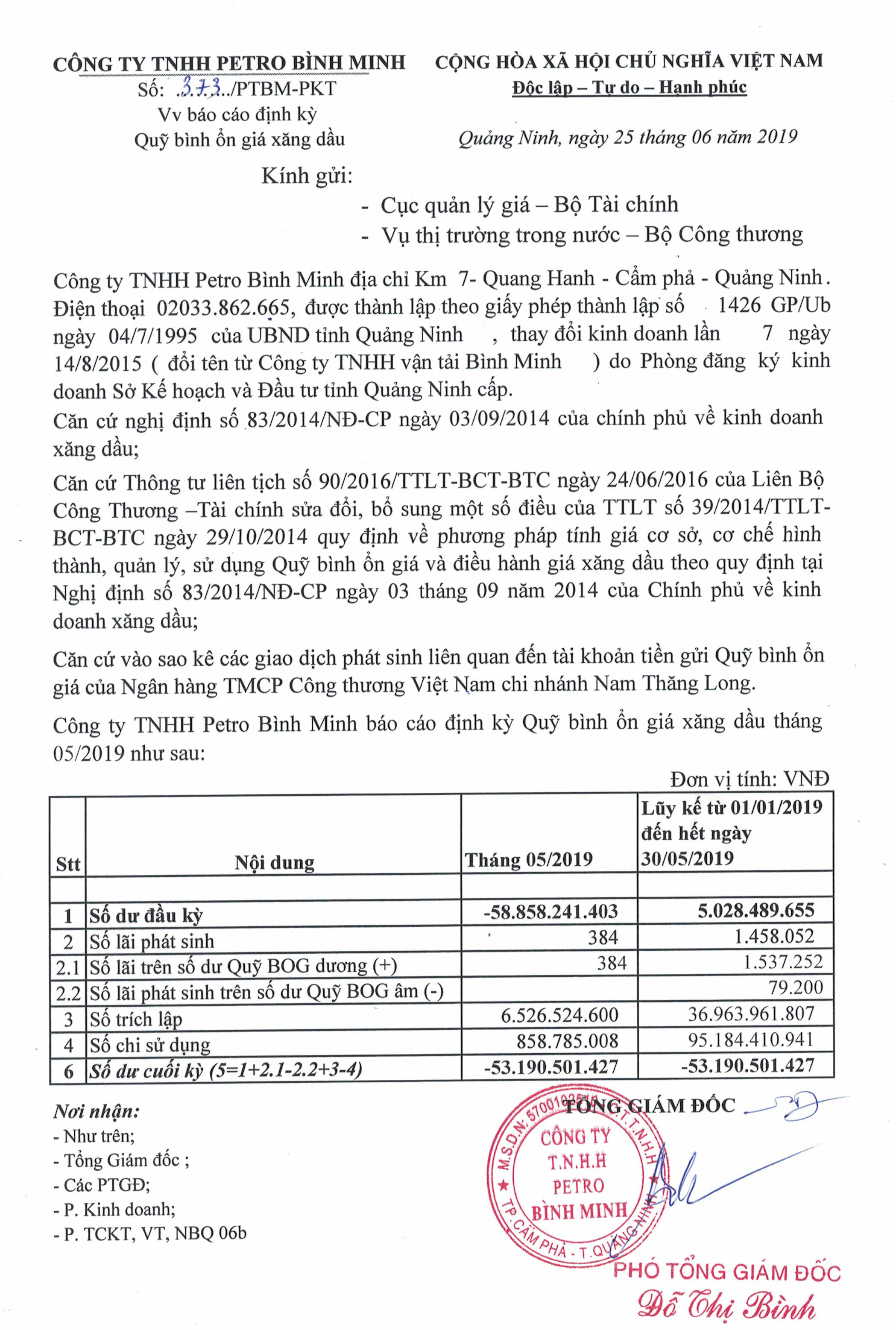 Báo cáo định kỳ Quỹ bình ổn giá xăng dầu (BOG) - tháng 05/2019