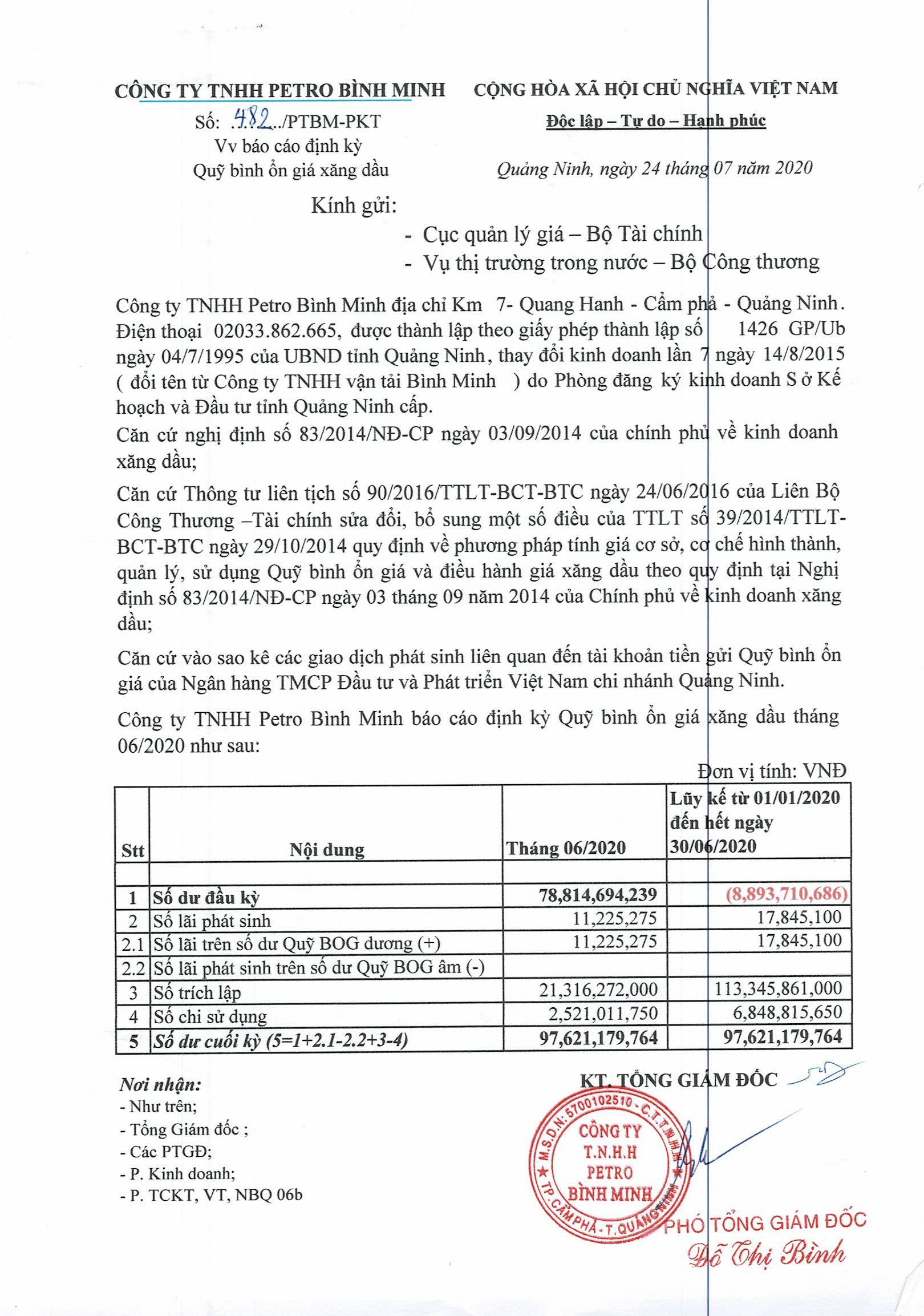Báo cáo định kỳ Quỹ bình ổn giá xăng dầu (BOG) - tháng 06/2020