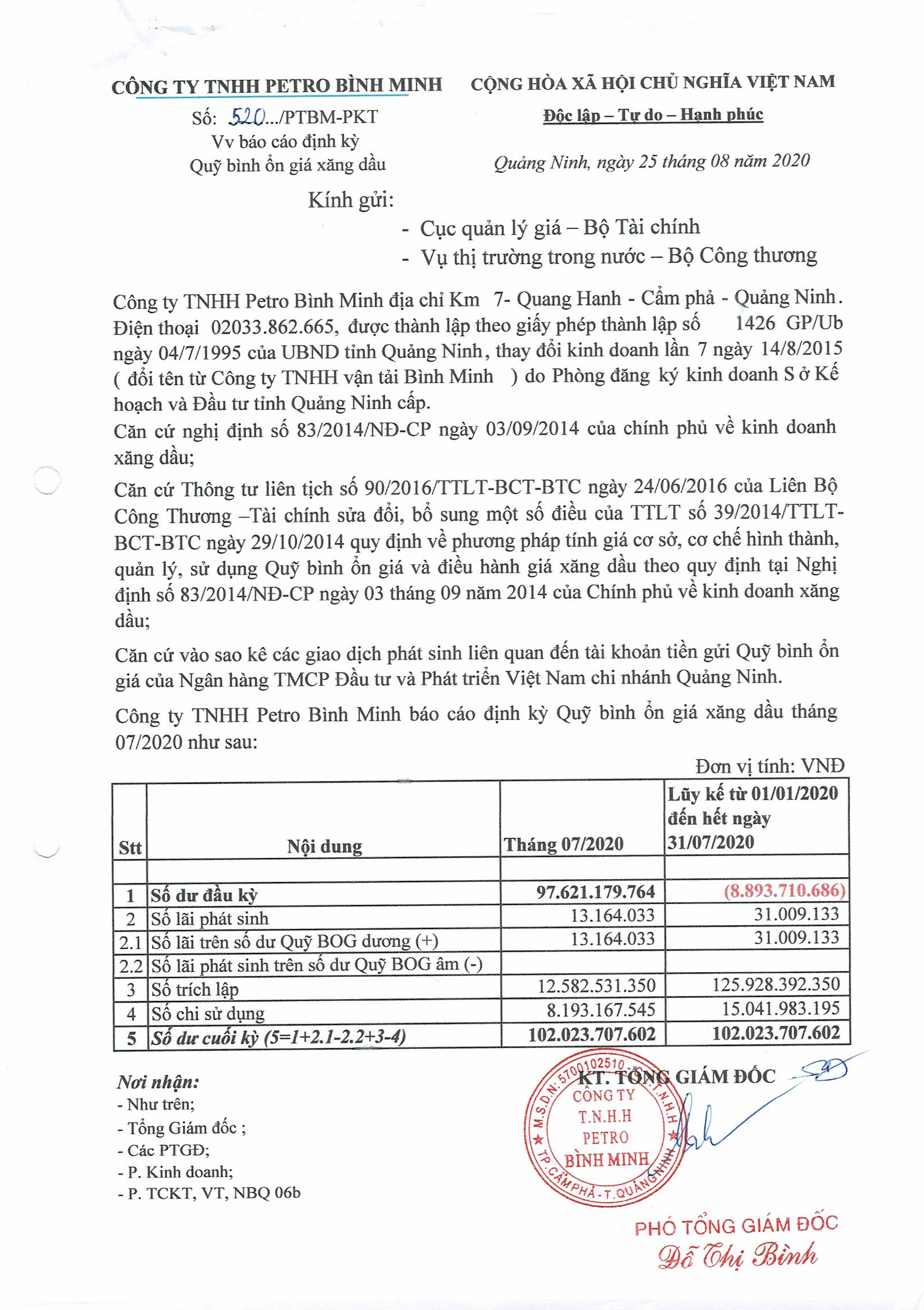 Báo cáo định kỳ Quỹ bình ổn giá xăng dầu (BOG) - tháng 07/2020