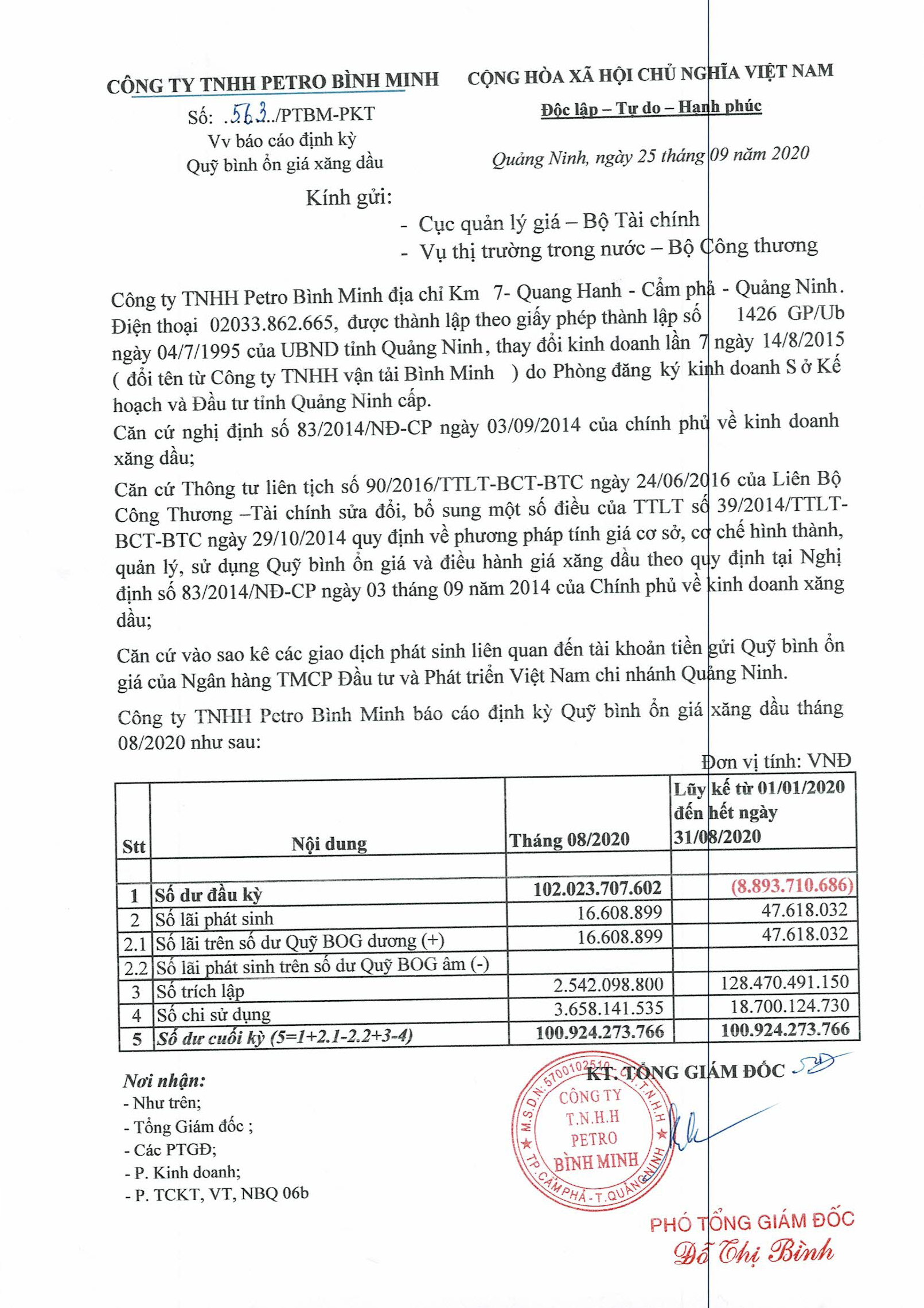 Báo cáo định kỳ Quỹ bình ổn giá xăng dầu (BOG) - tháng 08/2020